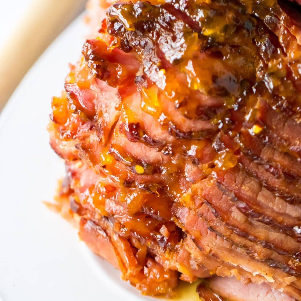 Theyβre similar in that weβre slow cooking a precooked spiral ham until fall-apart tender, coated with a sweet honey brown sugar glaze, but instead of just the sweetness from honey, brown sugar, and peach jam, weβre adding red pepper flakes for some heat.