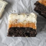 Cookies 'n Creme Caramel Layer Bars start with a layer of Pillsbury Cookies 'n Creme cookie dough, topped with a layer of caramel, chopped pecans, frosting, then finished with melted Cookies 'n Creme candy bars. I hope your sweet tooth is ready!